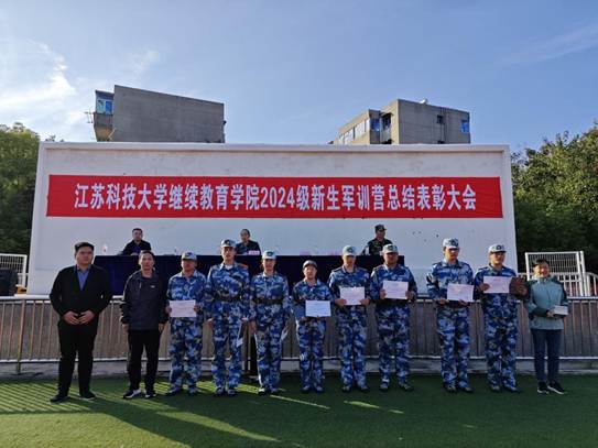 大會在雄壯的國歌聲中拉開帷幕。全體新生氣宇軒昂、英姿勃發,在教官的帶領下,列著整齊的隊伍,以威武的軍姿,昂揚的斗志,響亮的口號,嚴謹的紀律,過硬的素質接受各位領導的檢閱。匯報表演結束后,江蘇科技大學繼續教育學院學工辦主任蔣春雷教授宣讀本次軍事訓練表彰決定,院長助理、自考辦李主任,院團委書記夏老師,職培中心綜合辦楊主任為獲得表彰的同學頒發榮譽證書及獎品。