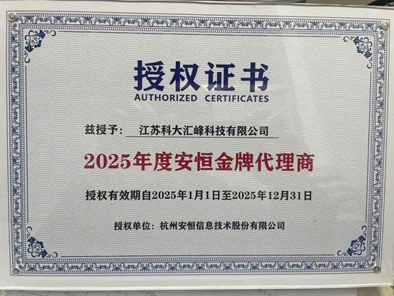 近日,江蘇科大匯峰科技有限公司獲頒“2025年度安恒金牌代理商”授權證書,授權方為杭州安恒信息技術股份有限公司,有效期覆蓋2025全年。